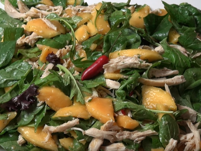 Може да използвате останало пилешко месо от предния ден или да изпечете на скара (грил тиган) пилешки гърди, овкусени със сол и пипер. За дресинга – смесете сока от лайм, наситнената люта чушка, наситнения магданоз и соевия сос. Разбъркайте добре. Нарежете пилешкото и мангото на ситно. В купа сложете салатения микс (спанак, рукола, маруля), пилешкото, мангото, залейте с дресинга и разбъркайте.
