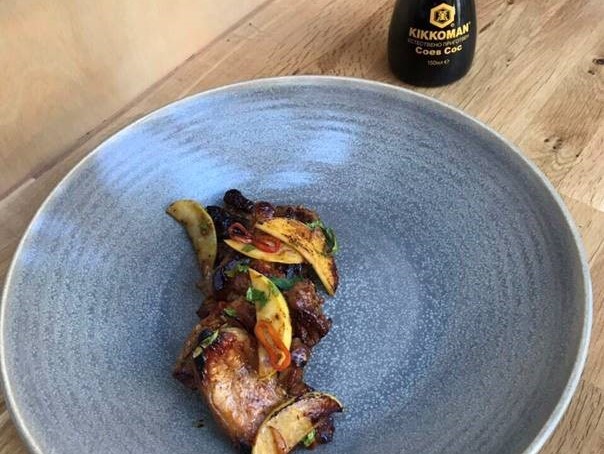 От шеф Петър Михалчев: Свински гърди на плоча с ябълки, люти чушки и соев сос Kikkoman