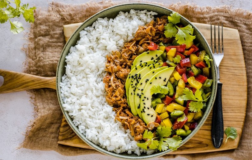 Терияки джакфрут с ориз и авокадо (веган рецепта)