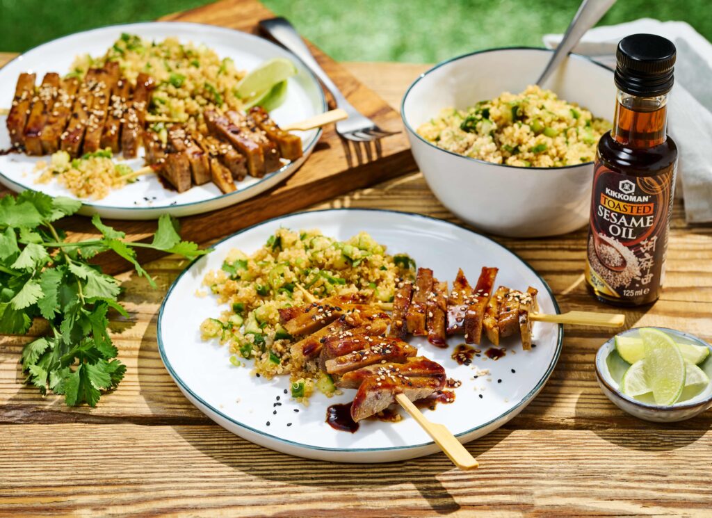 Пикантни шишчета от сейтан, мариновани в ароматен соев сос със сусам и кимион, съчетани с освежаваща салата от сусам и киноа – вкусен фюжън, който ще задоволи любителите на веган храната и класическата кухня! А уникалният умами вкус е гарантиран от дуото естествено ферментиралия соев сос Kikkoman и Kikkoman КИМЧИ пикантен чили сос. Насладете се […]