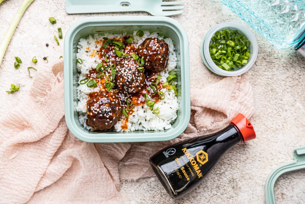 Ето и поредното ни предложение с максимум вкус и минимум усилия. След вкусните Сандвичи с паста от сьомга, Рибена супа със скариди и треска и Тиквените палачинки (веган рецепта) е време за Кюфтенца, глазирани в сос шрирача с ориз и уникалния умами вкус на Kikkoman естествено ферментирал соев сос.