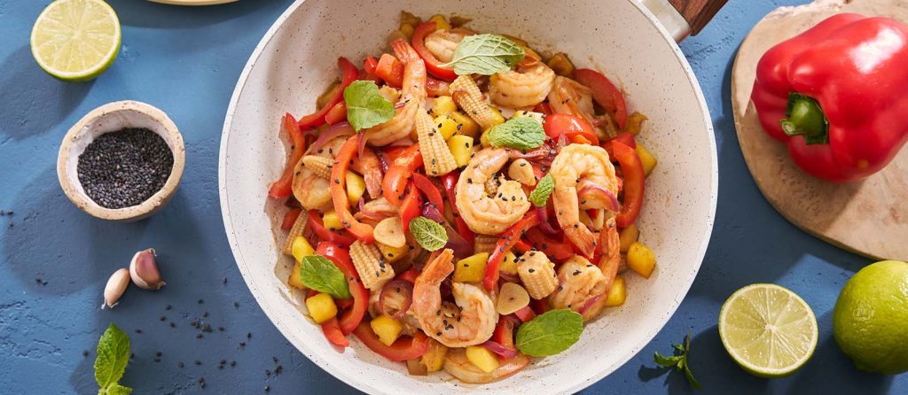Ярко запържено ястие със скариди, манго и лайм, подсилено от дълбокия умами на Kikkoman ЛАЙТ с по-малко сол – перфектен баланс на свежест и богат вкус във всяка хапка.