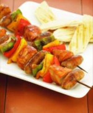 Смесваме всички продукти за маринатата в голяма купа. Мариноваме в нея месото и наденичките за 1-2 часа. Изцеждаме ги от течността и ги набождаме на шишчета, като ги редуваме с чушките. Печем на барбекю или грил поп 10-15 минути от всяка страна. Сервираме шишчетата с любимата си гарнитура. Аз препоръчвам 3 рецепти: