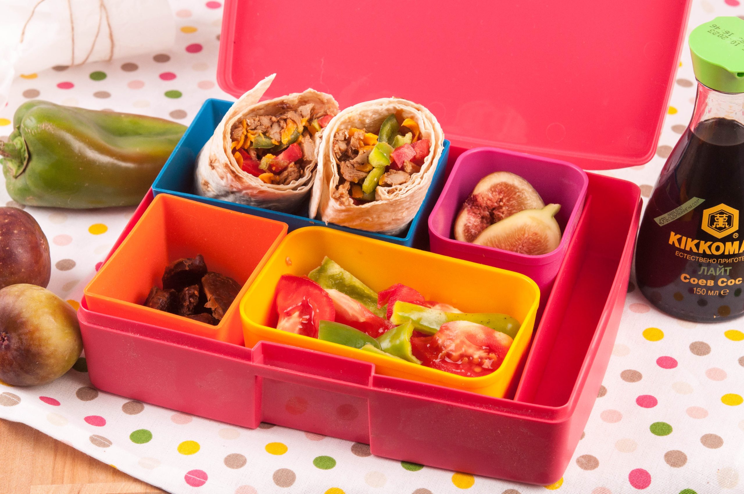 Sandwiches, fruits and vegetables in food box, backpack on old wooden background. Concept of child eating at school. Top view. Flat lay.