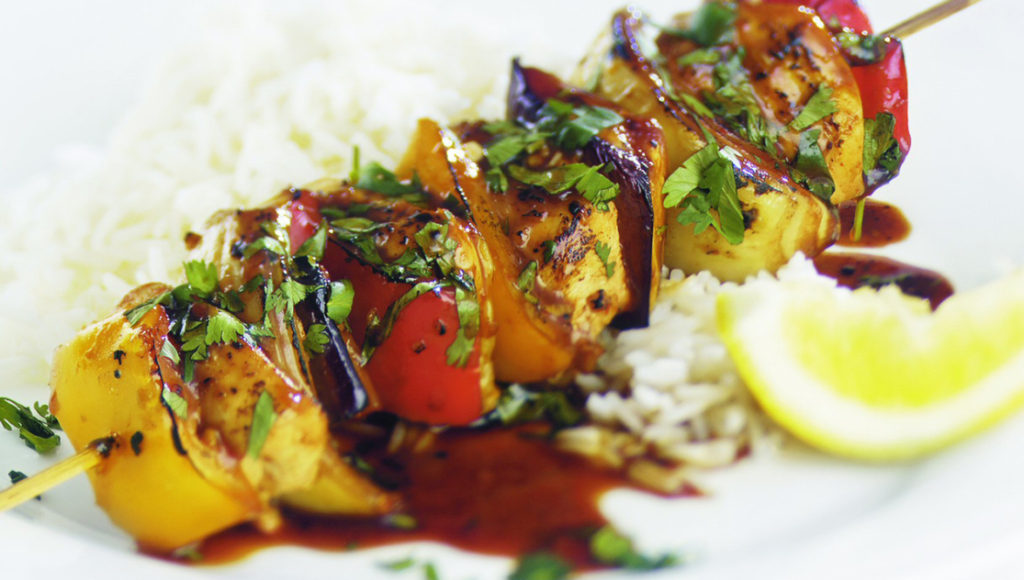 2. Нанижете парчетата месо и зеленчуци, редувайки ги през едно, на шишчета. Изпечете на скара или барбекю за 6-8 минути, като ги въртите бавно