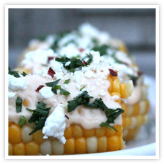 Сваряваме на пара царевицата докато омекне. Може да ги купите и готови, сварени. В дълбока купа разбиваме майонезата и соевия сос, докато се смесят добре. Разрязваме царевиците на две половини и ги поливаме със соса. Отгоре поръсваме босилек, сусама и червения пипер.