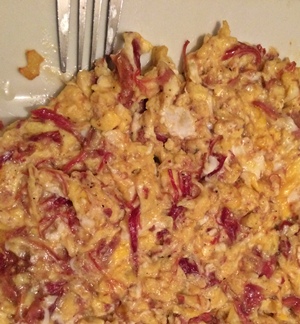 Тиганът се нагрява с 25 г масло. Яйцата се разбиват и се пържат в тигана под формата на омлет. Готовият натурален омлет се смесва с гъбите и соса Кикоман. Отгоре се поставят нарязаните на ивички шунка, настърганите домати, кашкавалът и се поръсват с подправките.