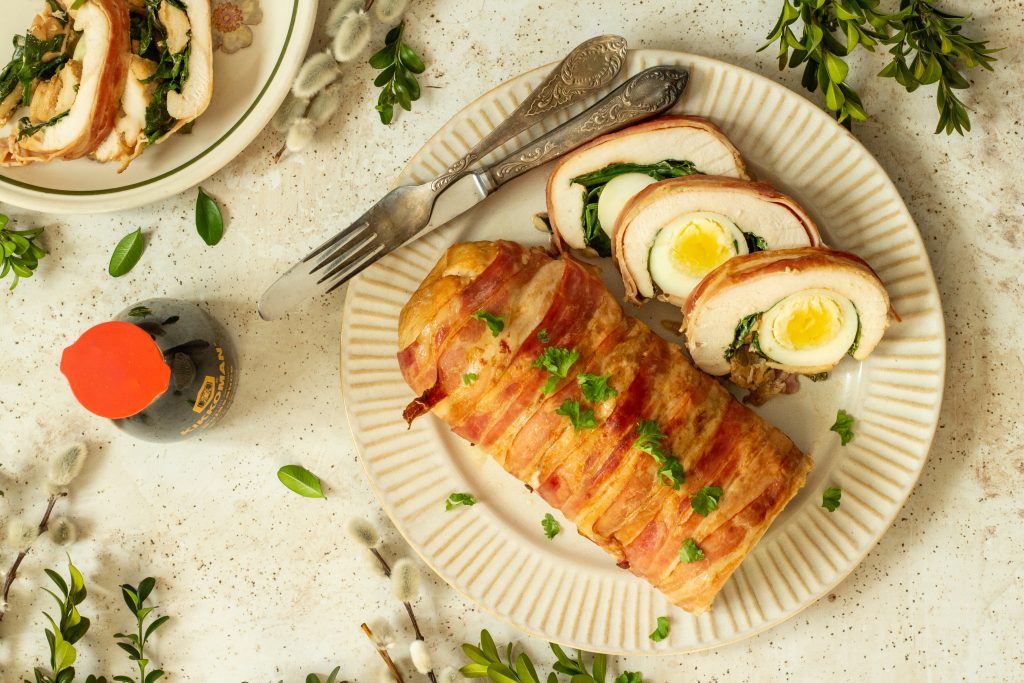 Комбинация от пилешко месо с бекон и пролетно руло от спанак. Рецептата е обогатена с яйца, които след нарязване на рулото осигуряват страхотен визуален ефект. Насладете са на този чудесен пролетен вкус!