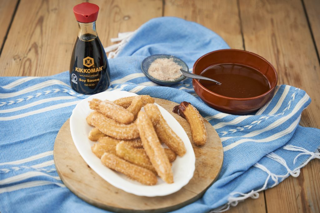 • За шоколадовия сос добавете масло, млякото и нарязания шоколад в малък тиган за сос. Загрейте леко, докато шоколадът се разтопи и разтвори в млякото. Подправете с естествено ферментирал соев сос Kikkoman и сервирайте с чуросите.