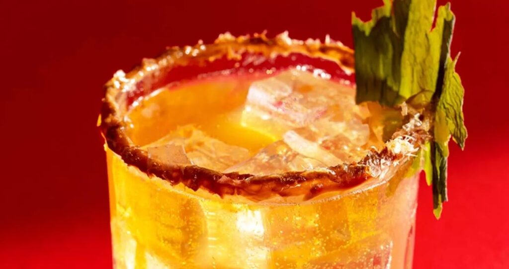 - С помощта на четка нанесете слой “боя” върху ръба на чаша. Поставете натрошени люспи от паламуд в плитък съд и потопете боядисания ръб в люспите. Добавете кубчетата лед към чашата. Налейте уискито и содата и гарнирайте с малкото парче комбу.