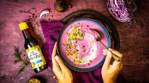 Добавете малко цвят към вашите зимни ястия с нашата супа от червено зеле. Червено зеле и картофи се смесват с чесън и червен лук, подправени с Kikkoman PONZU цитрус, копър и мъничко сметана – идеални за сгряване в студените дни.