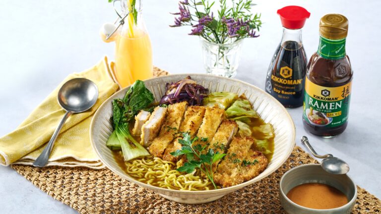 Нов поглед към рамена с хрупкав шницел, маринован в марината Kikkoman Терияки марината, поднесен с ароматна супа от рамен с къри — насладете се на шницел, къри и рамен в едно ястие! Умами вкусът е гарантиран от перфектна Kikkoman комбинация: Kikkoman Терияки марината, Kikkoman PANKO, естествено ферментирал соев сос Kikkoman, Kikkoman основа за рамен супа … Продължете с четенето на Къри рамен шницел в Терияки марината
