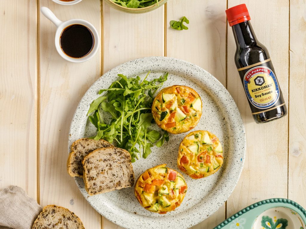 - Разбийте яйцата с киселото мляко, брашното, бакпулвера и естествено ферментирал соев сос Kikkoman. Добавете дивия лук и нарязаните зеленчуци и разбъркайте добре. Изсипете във форми за мъфини, намазани със сусамово олио и печете около 25 минути.