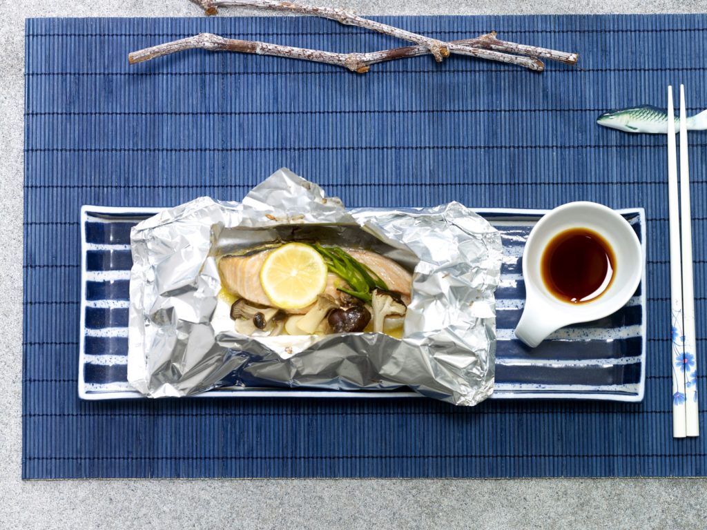 - Измийте гъбите и ги нарежете на парчета, подходящи за една хапка. Смесете ги с 4 с.л. соев сос. Измийте праза и го нарежете по диагонал на фини ленти. Измийте сьомгата, подсушете я и я овкусете със сол и пипер.