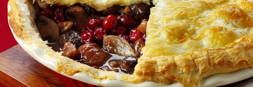 Слагаме боровинки към кестените и микса от гъби за пая. Разточваме тестото върху набрашнена повърхност и поставяме всичко към плънката за пълнене. Мажем с разбитото яйце. Правим три малки цепки и печем в продължение на около 25 минути или докато паят стане златисто кафяв.