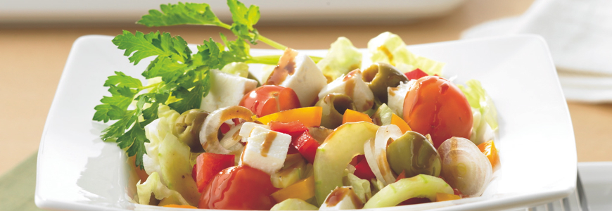 Почистваме червената и жълтата чушка от семките и ги нарязваме на половинки, а след това на кубчета. Нарязваме на половинки и чери доматите. Обелваме краставицата, нарязваме я наполовина по дължина и използваме лъжица, за да премахнем семките, за да стане като лодчица, а след това я нарязваме на филийки. Взимаме марулята, измиваме я и я нарязваме. Обелваме чесъна и лука, накълцваме чесъна и нарязваме лука на тънки пръстени. Продължаваме със сиренето като го нарязваме на кубчета. След нарязването на всички продукти, ги смесваме в по-голям съд или купа за салата и разбъркваме. За финал украсяваме със зелените маслини.