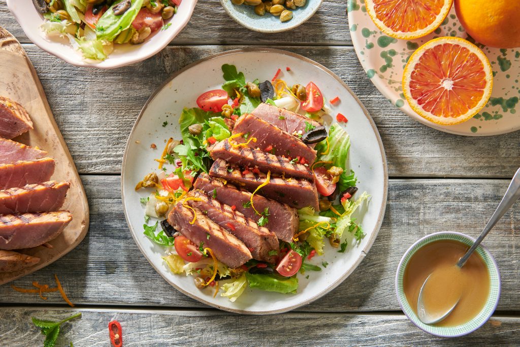 Сочна риба тон на скара върху хрупкава салата със сусамов дресинг – леко и освежаващо предложение за летен обяд. Овкусени и с допълнително свежест, благодарение на Kikkoman PONZU цитрус и естествено ферментирал соев сос Kikkoman.