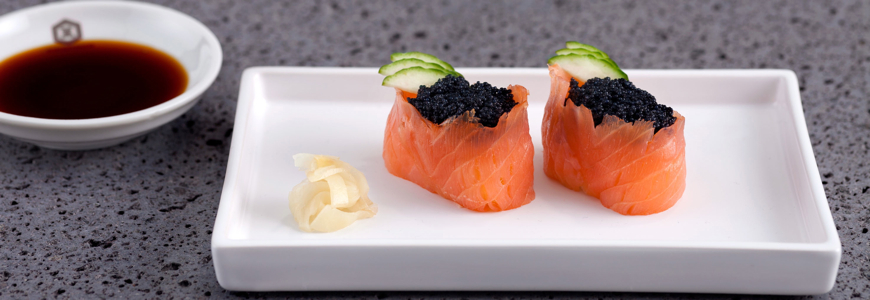 За всяко рулце суши използваме около 15 г ориз, който оформяме с пръсти като чашки, в средата им правим кладенче. Обвиваме “чашката” с парче сьомга. В кладенчето слагаме малко топено сирене, хайвер и украсяваме с краставица. Разбира се сервираме гукан суши с класическия натурален и първокласен Кикоман соев сос.