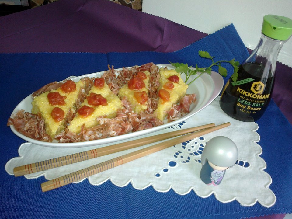 Много се радвам, когато на страниците на блога ми има конкурс, защото тогава получавам куп писма, запознавам се с нови приятели и научавам нови рецепти. По повод последната игра с приятелите ми от Kikkoman – “Бъди победител вкухнята – играй и спечели” – актрисата Мая Кисьова (сред победителите) ми предложи една уникална рецепта – 3 в 1! Това е нейна импровизация, в която Кикоман лайт соев сос обединява балканската, апенинската и японската кухня. Мая нарича ястието „Качамак с прошуто с японски продукти” – вижте го: