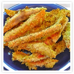 Загряваме фурната до 200 градуса. Разбиваме белтъците на пяна. Изсипваме брашното в дълбока купа. В друга купа смесваме панко /или галетата за паниране/, чесънът на прах и италианските билки. Овалваме нарязаните на пръчиците картофи в брашното, след това – в белтъците и след това – в билковата галета смес. Притискаме панировката с пръсти, за да залепне добре. Нареждаме картофите върху хартия за печене или в тавичка с незапепващо дъно. В оригиналната рецепта, за да потъмнеят, трябва да напръскаме картофите с cooking spray – смес от олио, вода, лецитин и още съставки. В случай, че не разполагаме с това, напръскваме картофите с кухненски пулверизатор с олио и след това ги напръскваме с вода с друг пулверизатор. Печем картофите около 15 минути, докато станат златисти. Сервираме ги с Кикоман терияки маринатата .