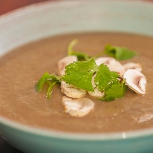Накрая прибавяме соевия сос на вкус. Пюрираме супата с пасатор. Сервираме с парченца задушени гъби, стръкче пресен кориандър или филия препечен хляб.