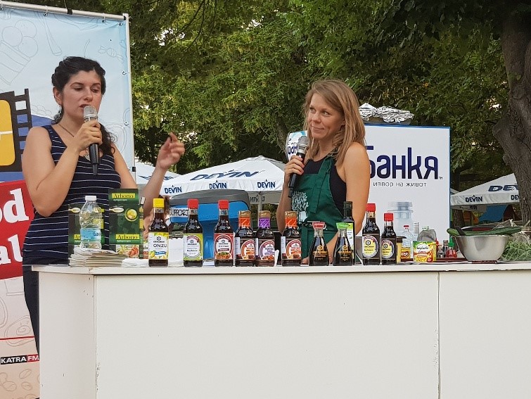 И понеже на фестивал за храна няма как да не говорим за това как да подобрим вкуса, успяхме да разкажем и за своя опит с  естествено ферментиралия соев сос Kikkoman. Демонстрирахме и качествата му на универсална подправка, която не може да бъде затворена само в азиатската кухня, като дадохме възможност на гостите да опитат свежа салата. И ако свежа салата ви звучи скучно, към нея добавихме специален дресинг с новия продукт на Kikkoman – Ponzu сос.