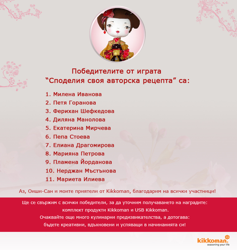 Именно с цел да ви предизвикаме да рискувате и да участвате, преди известно време с приятелите ми от Kikkoman направихме игра, в която всеки любител имаше въможност да сподели своята авторска рецепта. И днес дойде денят, в който да обявим победителите. А ето ги и тях: