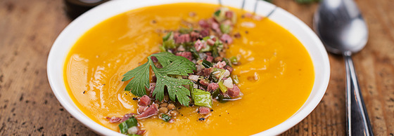 Слагаме тиквата и чесъна в тигана и ги запичаме на котлона закратко, след което изливаме бульона. Оставяме на средна температура да къкри 20 минути, докато тиквата омекне напълно. С пасатор я правим на пюре. Оше докато е топла, слагаме сварената леща. Подправяме с Кикоман соев сос и черен пипер. Сервираме в дълбока чиния, като отгоре сипваме малко бекон и зелен лук. Завършваме декорацията с лист магзаноз.