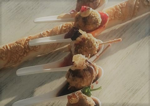 - След това се оформят като средно големи кюфтета. Едно яйце се разбира с една супена лъжица соев сос Kikkoman. В тази смес се овалват кюфтетата, а след това се поръсват със смесените в пропорция едно към панко и корнфлейкс.