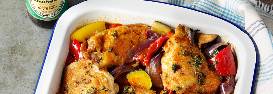 Имам една приятелка, тя прави груб план на менюто за всяка седмица: пиле, риба, кайма, барбекю, нещо без месо, супа, салата, сандвич, аламинут, а за уикенда – десерт. Може и вас да ви наведе на някои идеи. А днес съм намислила една рецепта за лятно пиле със соев сос Кикоман и сезонни зеленчуци.