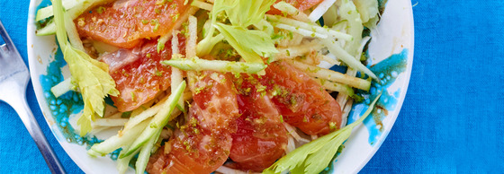 Обелваме целината и я нарязваме по дължина на много тънки ленти. Слагаме целината в голяма чиния за салата, отгоре разпределяме парченцата целина от корена.