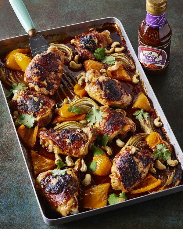 След 30 минути добавете нарязаната чушка в тавата и полейте всичко със сос Teriyaki. Върнете във фурната за още 15 минути, след това добавете печеното кашу и върнете тавата във фурната за още 10 минути. Сервирайте с печени сладки картофи или ориз.