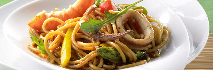Сваряваме спагетите по описанието на опаковката и ги изцеждаме добре от водата. Измиваме и обелваме кралските скариди и калмарите и ги нарязваме на хапки. Обелваме аспержите и ги нарязваме на парчета по 3 см. Измиваме половин кг чери домати. Измиваме жълтата чушка и я нарязваме на ленти. Измиваме руколата и я изцеждаме добре от водата.