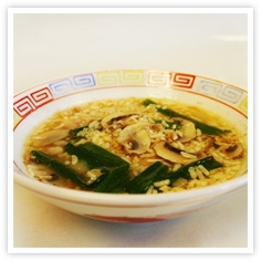 Нарязваме пилешкото месо на хапки и го сотираме с олиото. Междувременно в голям тиган загряваме пилешкия бульон, прибавяме гъбите, водните кестени и Кикоман соевия сос. Оставяме ги да врат 5 минути. Загряваме сусамовото олио в дълбок тиган и изпържваме в него ориза, добавяме вода и готвим до готовност. Разделяме пилешкото месо на 4 порции в 4 купички, добавяме ориза и украсяваме отгоре с нарязани пера зелен лук.