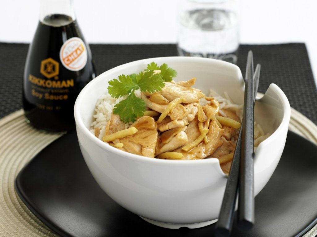 • Загрейте тиган, добавете зехтина и запържете в него чесъна и джинджифила до светлокафяво. Добавете пилешкото месо. Пържете и разбърквайте в продължение на 2 минути, след което добавете всички подправки без водата.