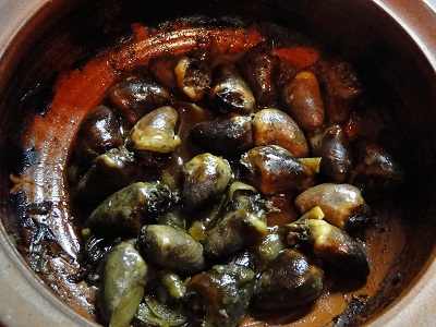 2. След това ги прехвърляме в гювеч, заедно с лука, който предварително сме нарязали на полумесеци. Поливаме всичко това с 1 ч.ч. от бульона, в който са се варили сърцата.