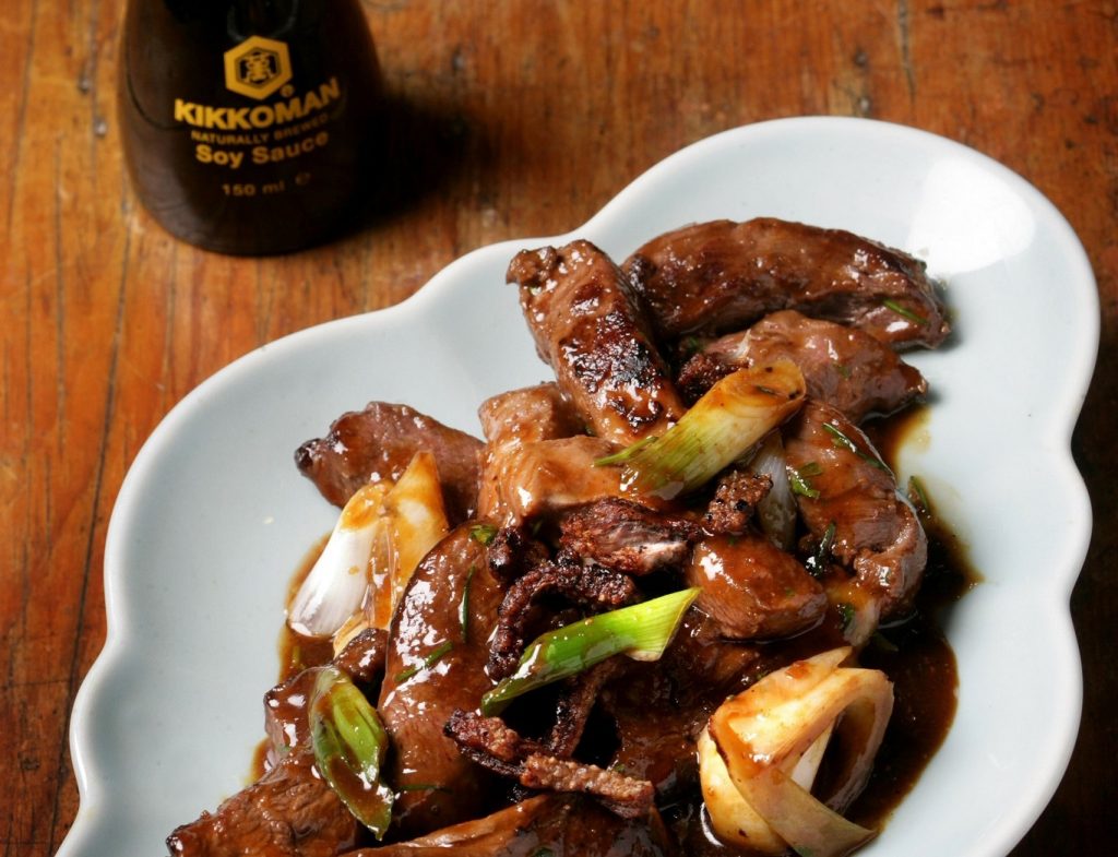 - Нарежете патешките гърди на ленти с дебелина около 1 см. Поставете ги в купа и добавете към тях соевия сос Kikkoman, виното, сусамовото олио, солта, пипера и брашното. Разбъркайте добре и оставете да се овкусява за около 15 минути.
