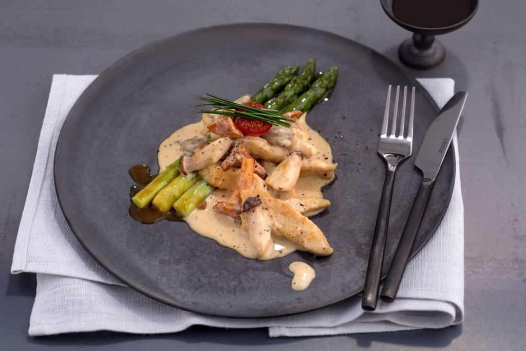 - Дръжте тигана на котлона, докато част от соса се изпари. Подредете пилето, гъбите, доматите и аспержите в чинии с гарнитура по избор. Украсете с див лук.