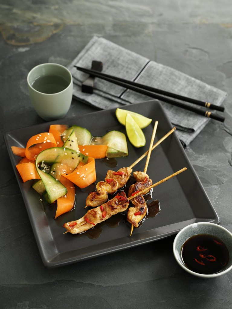 4. Печете на грил шишчетата около 3 минути на всяка страна или докато не станат готови. Посипете салатата от краставица със сусамовото семе и половината охладена нарязана чушка и сервирайте с горещото пиле.