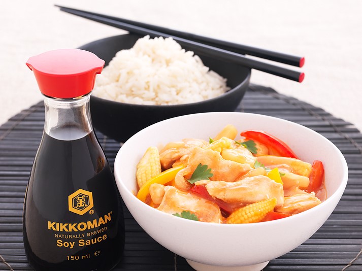 - Направете соса за пилето, като смесите кетчупа, соевия сос Kikkoman, белия балсамико оцет, захарта и царевичното брашно в малка купа.