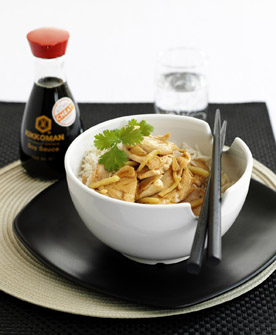 Нарязваме пилешкото месо на ивици. Намазваме ги със сусамово олио и ги оставяме настрана за 15 мин. Загряваме олиото и изпържваме чесъна и джинджифила, докато слабо покафенеят. Тогава прибавяме пилешкото и пържим около 2 минути. Добавяме всички подправки, освен водата. Задушаваме за 1 минута, докато подправките се поемат от месото. Сипваме водата и готвим още 2 минути.