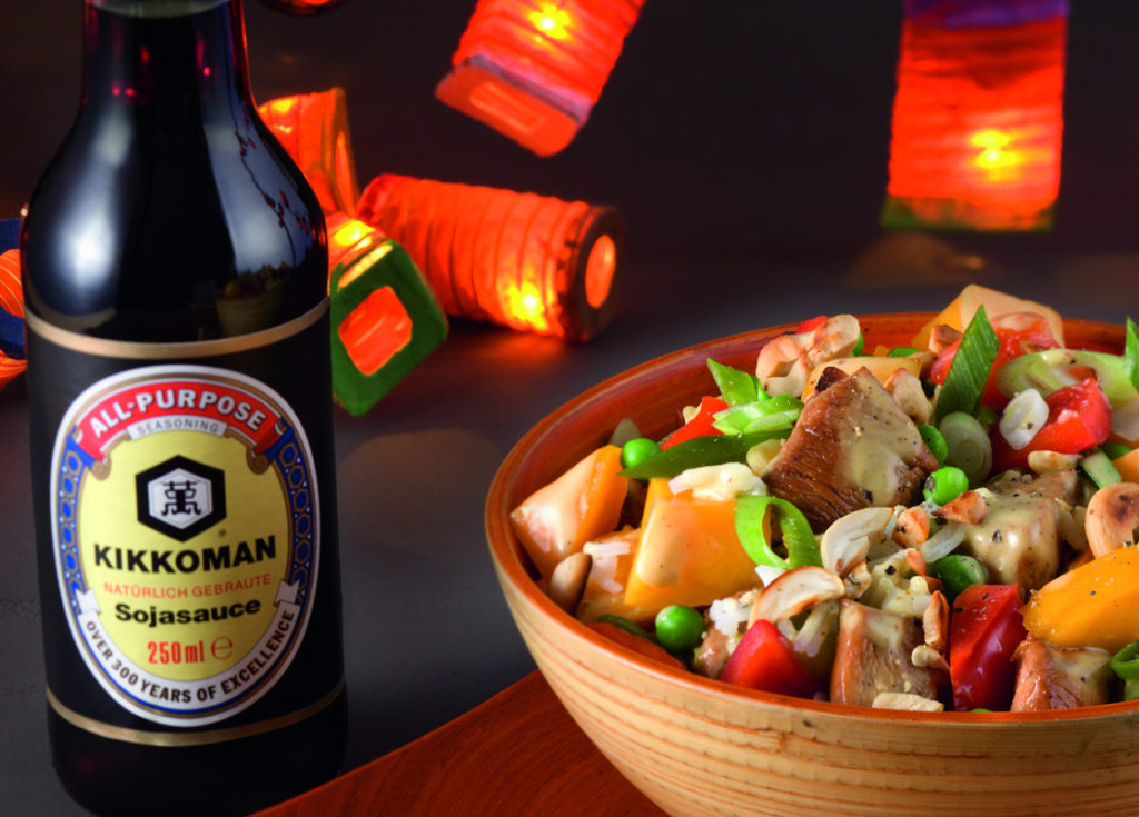 3. Смесете дресинга с останалото от Терияки маринатата, сложете сместа в салатата и подправете с пипера и кърито. Нарежете кашуто, поръсете отгоре и сервирайте. Добър апетит!