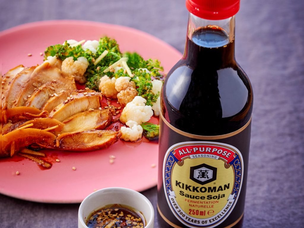 • Обелете джинджифила и го нарежете на тънки лентички. Поставете го в купа и към него добавете соевия сос Kikkoman, меда, сока от лимон, обеления и нарязан на много ситно чесън. Разбъркайте добре. Намажете обилно пилешките гърди с получената смес. Оставете да се овкусява за около 30 минути.