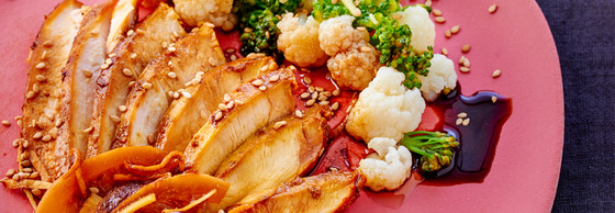 Сервираме пилето, нарязано на ленти, с гарнитура от зеленчуци. Накрая поръсваме с сусамовите семена.