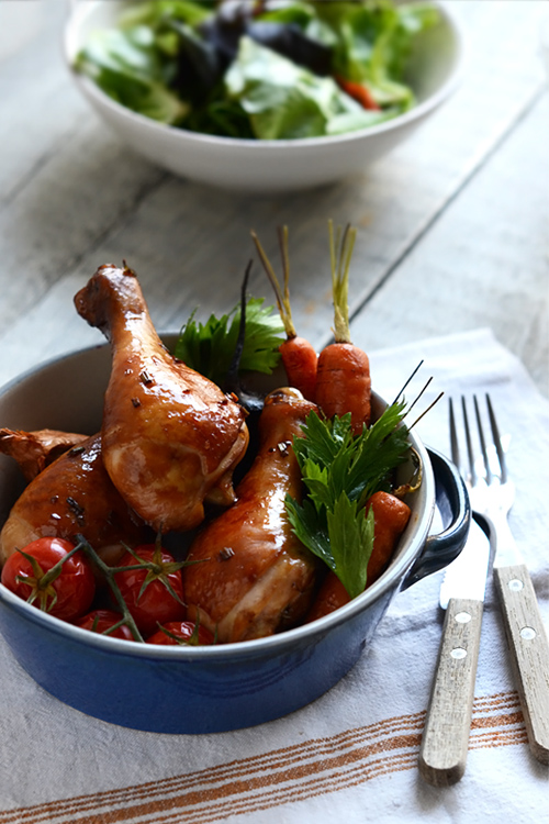 6. За зеленчуците: измиваме ги добре. Нарязваме някои от тях на две, за да се изпекат по-добре /цвеклото и лука/ и ги намазваме и тях отгоре със медената смес. Печем ги за около 20 минути, докато не се зачервят и ги добавяме към основното ястие като гарнитура.