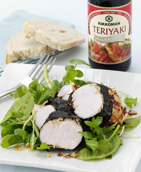 Поставяме пилешкото филе да се маринова за 30 минути в Кикоман Терияки марината. След това го овалваме в натрошените фъстъци. Разрязваме на две листата нори и ги увиваме около всяко парче филе на стегнато руло.