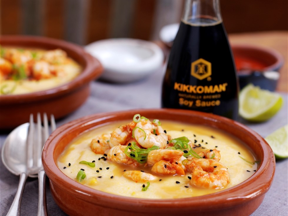 - Изсипете полентата в купички, отгоре поставете по няколко скариди и добавете от грейви соса.