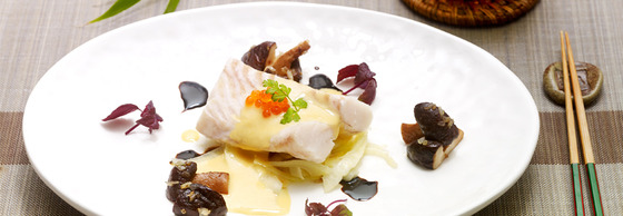 В средата на чиниите сипваме фенела. Върху него треската. Отгоре слагаме малко хайвер и заливаме с портокаловия сос. Отстрани слагаме гъбите и напръскваме с балсамовия соев сос Кикоман-Тамари. За финал – стръкче магданоз. Поднасяме с усмивка, наблюдаваме изражението на лицата на гостите и чакаме заслужените им поздравления.