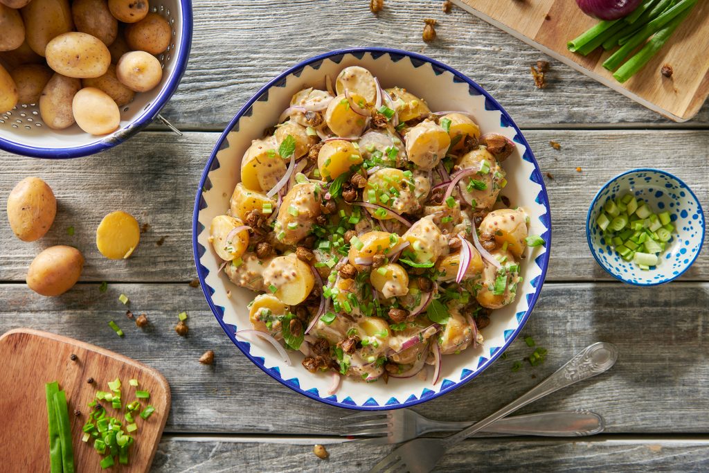 Картофената салата е съвсем заслужено една от най-популярните салати по време на BBQ сезона! Тази нова версия с хрупкави каперси, пресен розмарин и богат на умами вкус естествено ферментирал соев сос Kikkoman превръща класическата рецепта в ястие номер едно за всяко пиршество на открито.