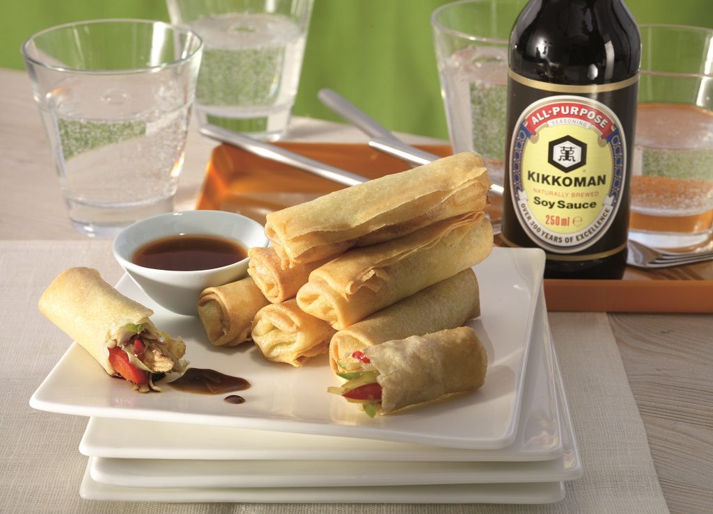 - Разрежете наполовина пилешките гърди и ги намажете със соевия сос Kikkoman и зехтина. Пригответе зеленчуците като нарежете на тънки ивици разноцветните чушки и зелето.